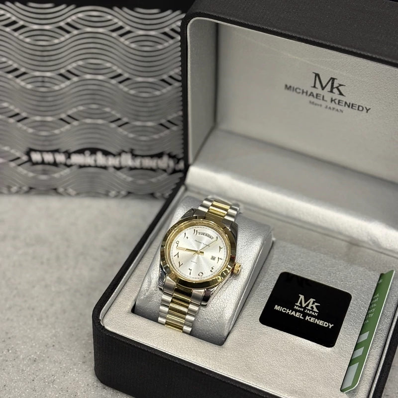 ساعت مچی مردانه اورجینال از برند مایکل کندی ایندکس فارسی موتور دو تقویم میوتا ژاپن بند استیل 316 شیشه مقاوم در برابر خش و ضربه ترکیب رنگ طلایی و نقره ای ضد آب در حد شست و شوی دست یکسال ضمانت به همراه کارت گارانتی