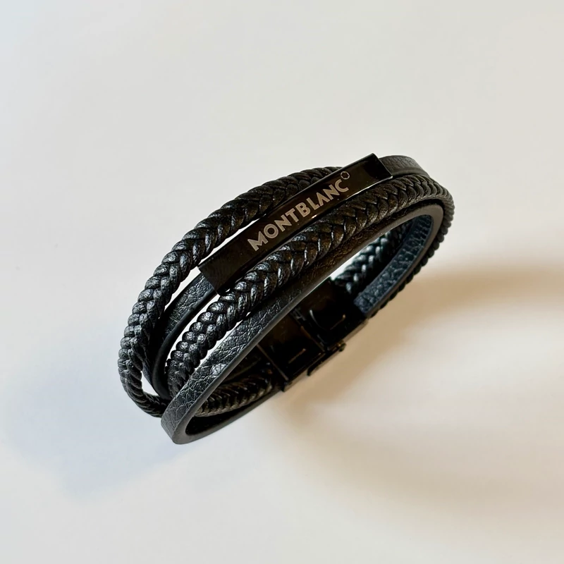 دستبند چرم چند تکه لگوی استیل مشکی رنگ مونت بلان چرم با کیفیت ضد حساسیت قفل سگکی فری سایز